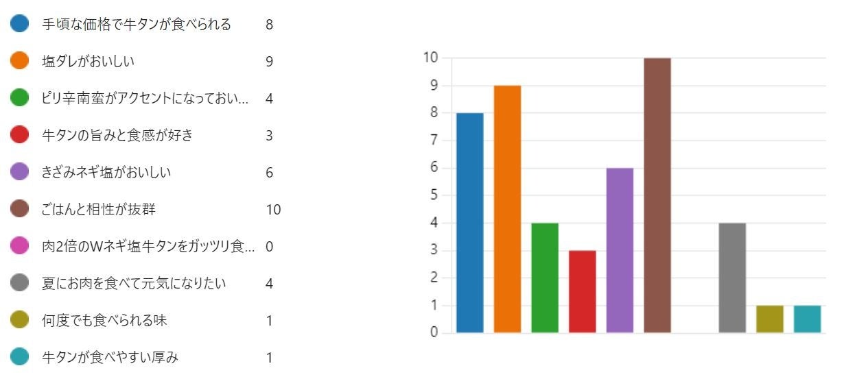 最も多くの票を集めたのは『ごはんと相性が抜群だから』というポイントでした。以下2位は『塩ダレがおいしい』、『手頃な価格で牛タンが食べられる』でした。