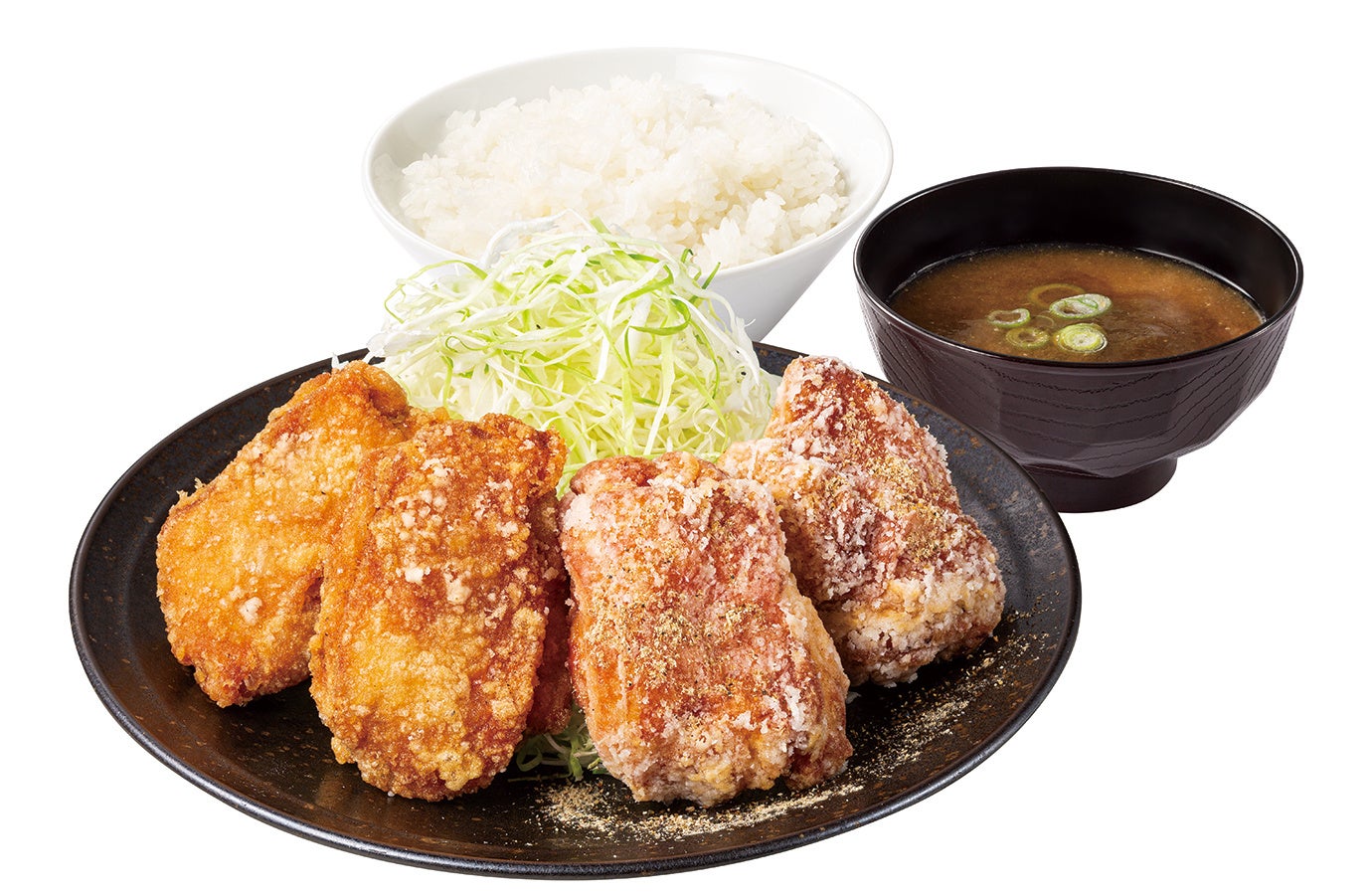 出汁からあげ2個、カリッともも2個、ご飯・みそ汁付