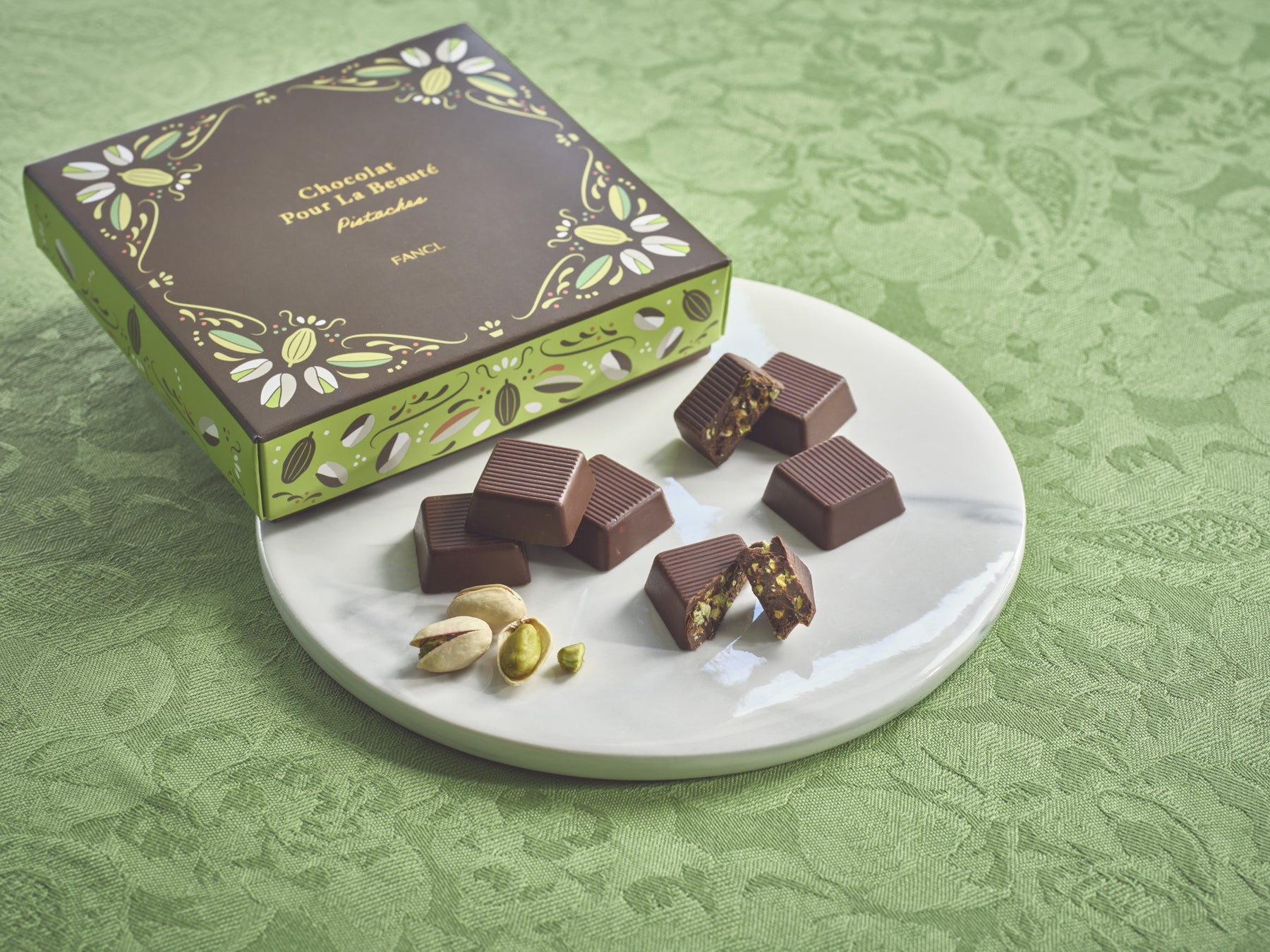 株式会社ファンケルは11月16日(木)から、「ショコラ プー・ラ・ボーテ ピスターシュ」(1箱10個入り/価格:1,400円<税込>)を通信販売と直営店舗にて数量限定で発売します。同製品は糖類不使用を実現しながら、カカオの深い香りで本格的な味わいが楽しめるチョコレートです。これまでも秋冬限定で販売し、健康と美容に気を使う方の願いを叶えた製品として、多くのお客様に好評でした。今年も糖類不使用はそのままに、チョコレートの風味をより感じられる製品へと進化しました。