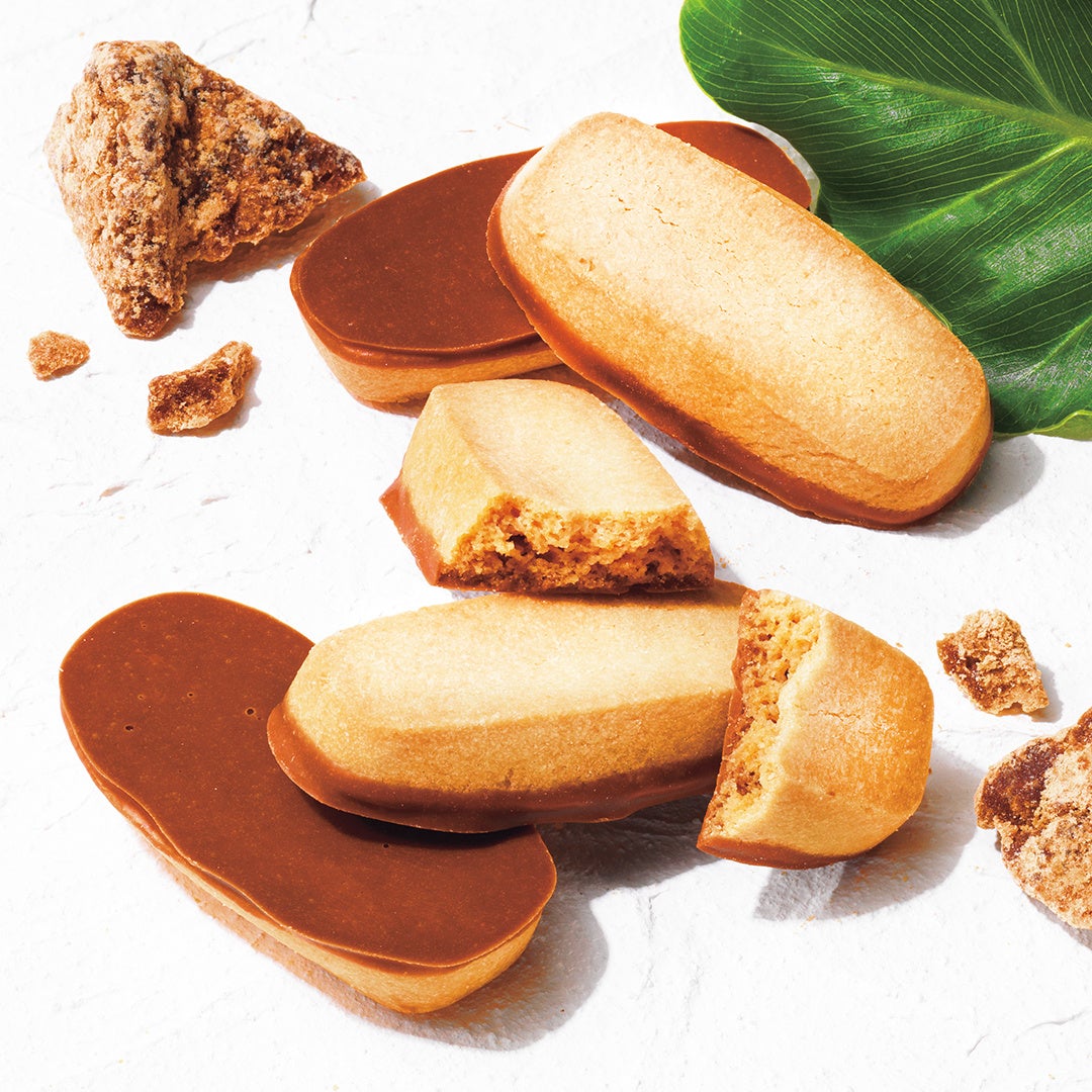 沖縄の郷土菓子をロイズのレシピでアレンジし、ザクザクとした食感が魅力のちんすこうに仕上げました。沖縄県産さとうきびのきび糖を使用したちんすこうの片面に、沖縄県産の黒糖を使ったチョコレートをコーティング。生地に効かせた塩味がアクセント。コクのあるきび糖と塩味、黒糖チョコレートの素朴でまろやかな味わいがとけ合います。