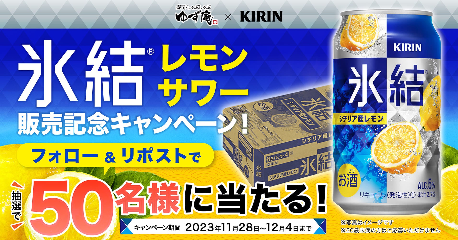 物語コーポレーション(本社:愛知県豊橋市/代表取締役社長:加藤 央之)が全国94店舗を展開する『寿司・しゃぶしゃぶ ゆず庵』(以下、ゆず庵)は、氷結®︎レモンサワーの販売を記念して、2023年11月28日(火)より公式X(旧Twitter)にて「キリン 氷結®︎ シチリア産レモン」1ケース(350ml缶×24本入り)が当たるプレゼントキャンペーンを開催いたします。