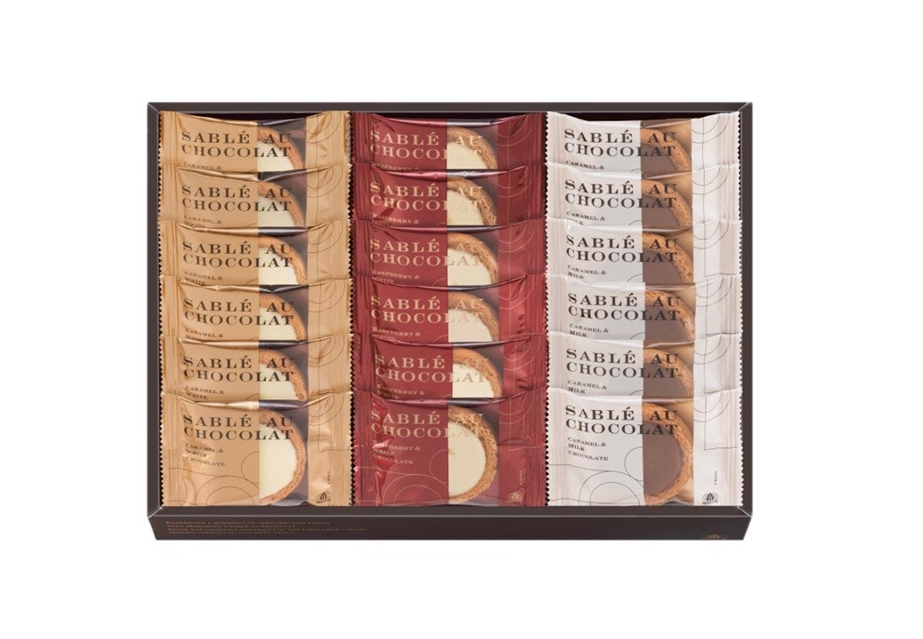サクサク食感のサブレ、くちどけの良いチョコレート、とろけるソースがあわさり、3つの食感と味わいの一体感をお楽しみ頂けます。