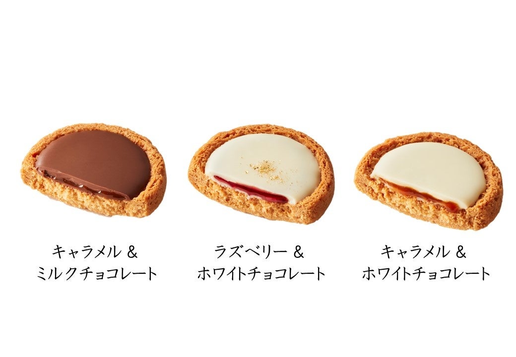 ロレーヌ産岩塩を加え、甘さの奥にほんのり塩味を感じられる、コク深くまろやかな味わいの「キャラメルソース」、色鮮やかで華やかな香りの「ラズベリーソース」。ひと口かじるととろっとあふれるソースがサブレの味わいをリッチに。