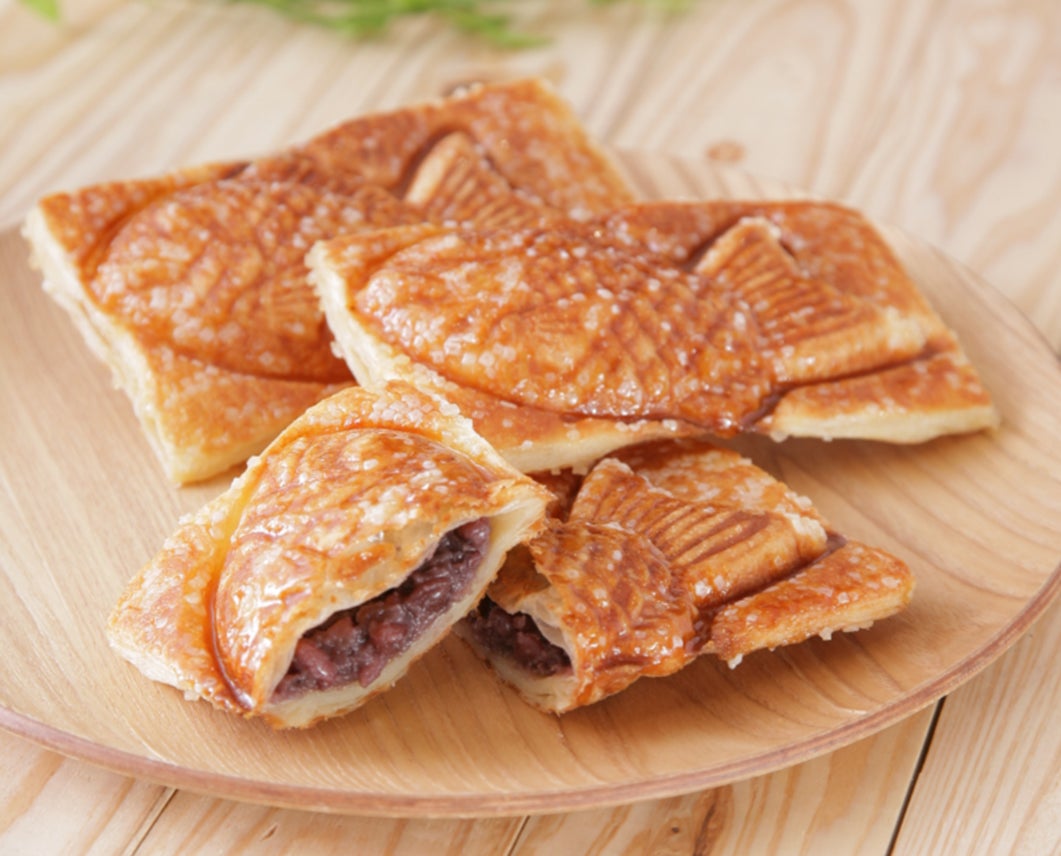 「クロワッサンたい焼」 は、当社が開発し、たい焼専門店 「銀のあん」 で発売したオリジナル商品です。24層の特製生地で自家製餡を包み、専用機器で両面から一気に焼き上げることで、香ばしく、独特の “サクッ” とした食感が生まれるオリジナルたい焼です。一口ほお張れば、芳醇な香りと自家製餡の豊かで濃厚な風味が口いっぱいに広がります。焼き立てはもちろん、少し落ち着かせ粗熱をとることで、より個性的な生地の食感が引き立ちます。