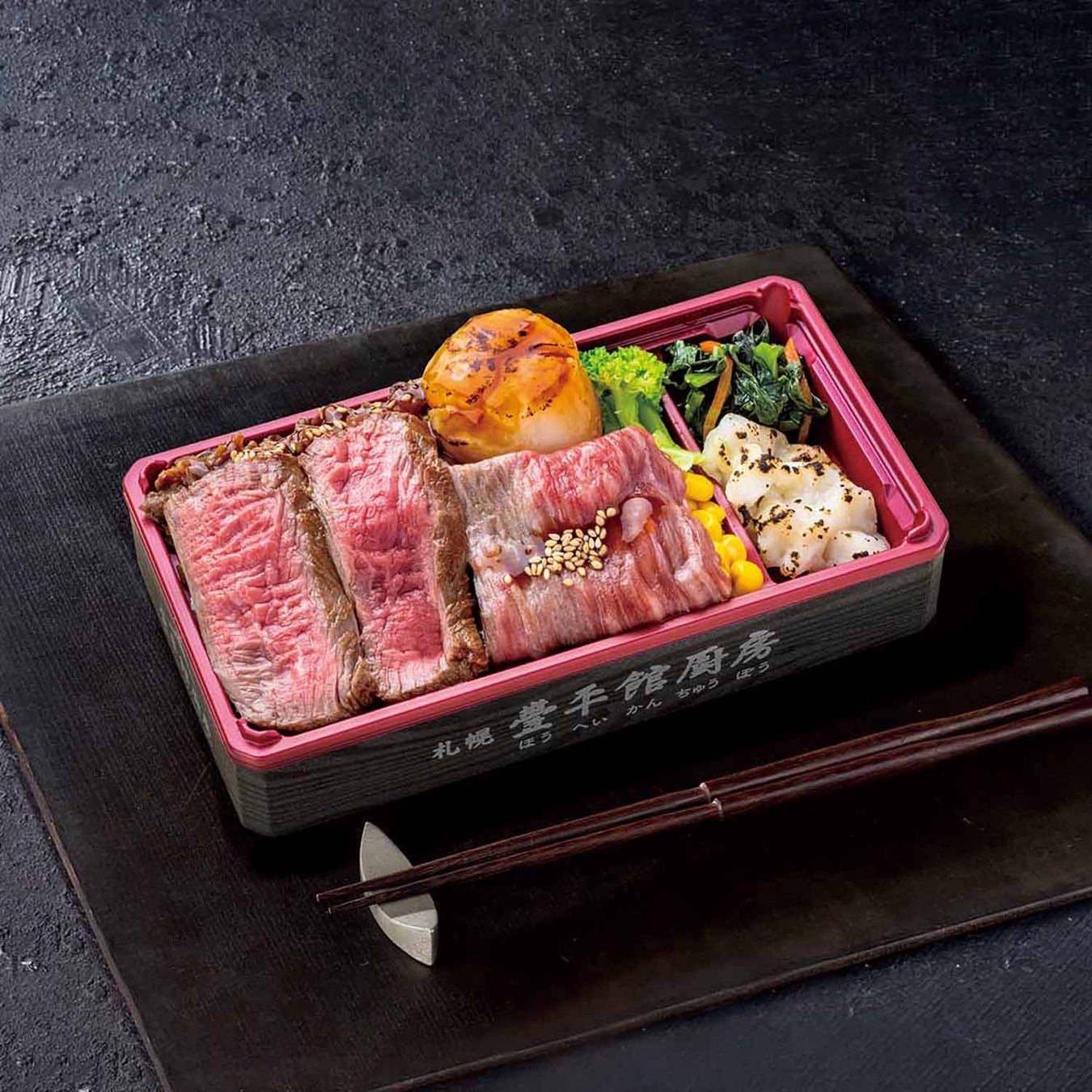 米沢牛のステーキと、自家製タレで焼きあげた焼肉が楽しめるお弁当。