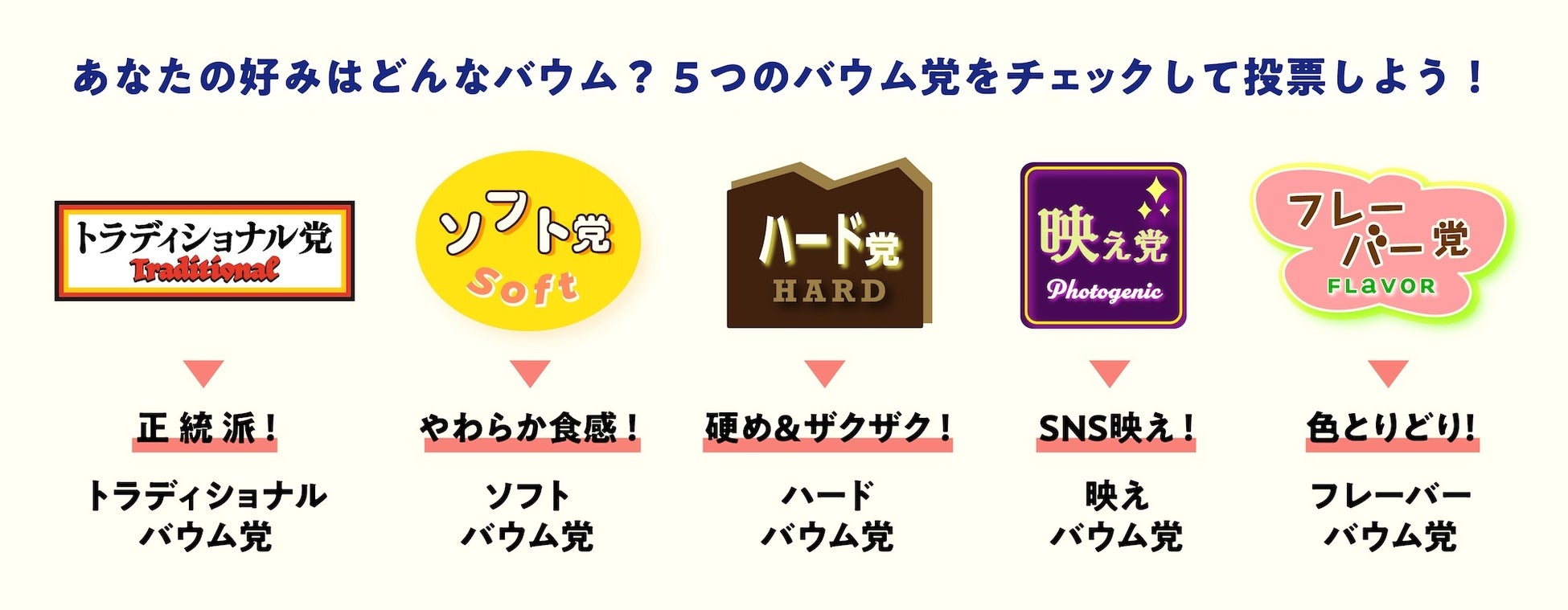 今回の総選挙では、バウムクーヘンのジャンルごとに5つの「バウム党」を結成!多種多様なご当地バウムクーヘンがタイプごとに分かれています。投票する際は、自分の好みのジャンルの「バウム党」から選んで投票してみてはいかがでしょうか!?