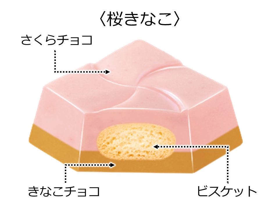 サクサク食感のビスケットをさくらチョコで包みきなこチョコを合わせました。