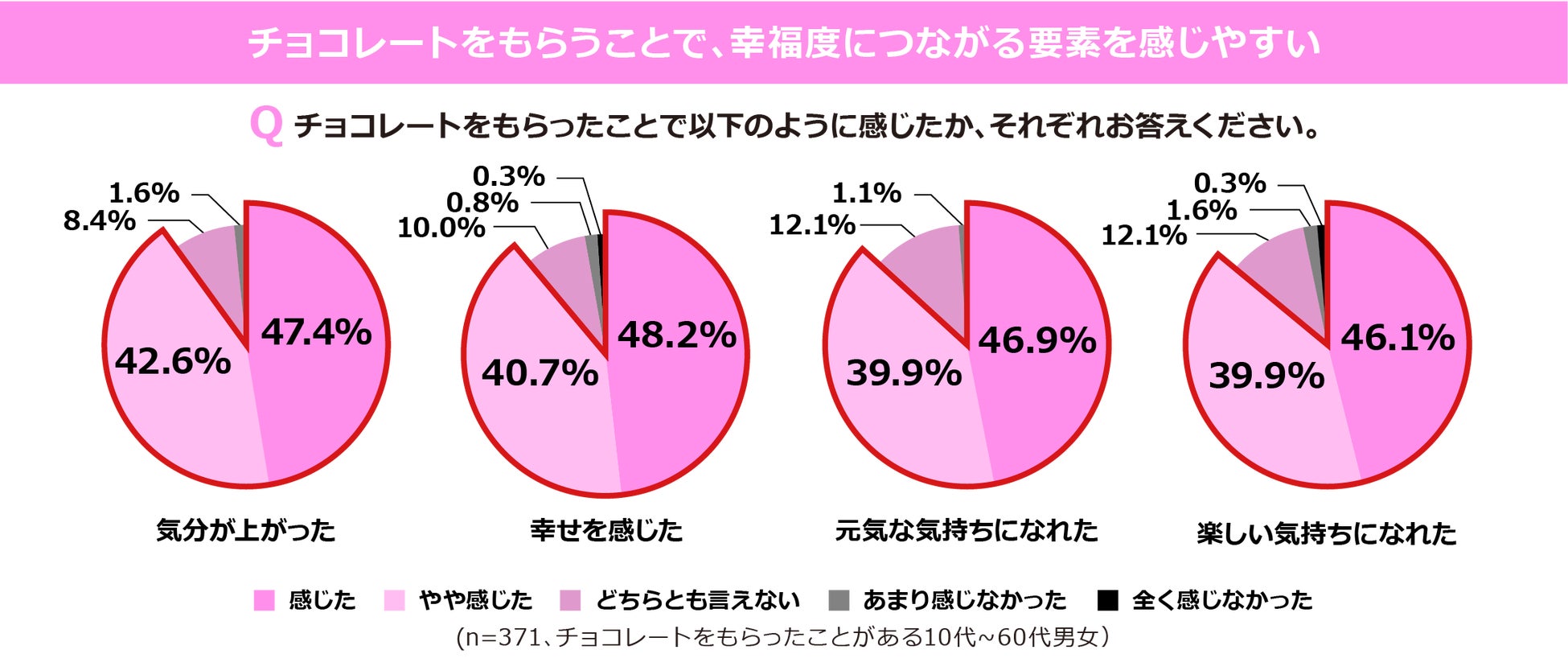また、チョコレートをもらったことがある人に、もらったことでどう感じたか聞いたところ、 9割近くが「気分が上がった」「幸せを感じた」と回答しました。さらに8.5割以上が「元気な気持ちになれた」「楽しい気持ちになれた」と回答し、もらうことは渡すこと以上に、前向きな気持ちの向上に寄与しており、幸福度向上につながっている可能性が考えられます。