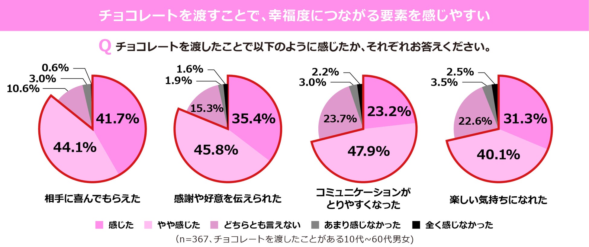 今回の調査から、チョコレートを渡す・もらうことで、「相手に感謝や好意を伝えられる」「前向きな気持ちの向上」といった幸福度につながる要素を感じることがわかり、さらに、幸福度の高低にも影響している可能性が明らかになりました。
