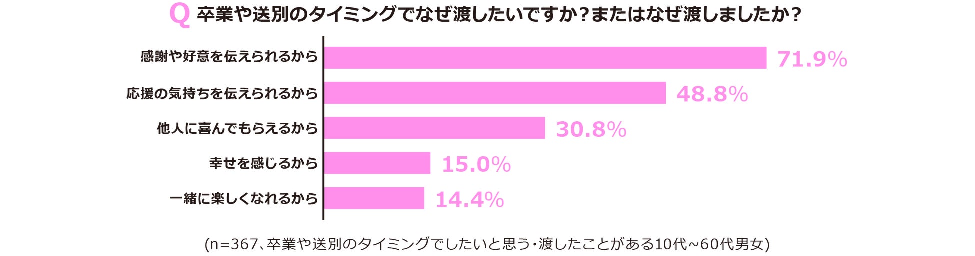 卒業や送別のタイミングで何かを渡したいと思う、または、渡したことがあるか聞いたところ、9割近くもの人が「渡したいと思う・渡したことがある」と回答しました。その理由として、7割が「感謝や好意を伝えられるから」、約半数が「応援の気持ちを伝えられるから」を挙げており、卒業や送別のタイミングが、幸福度向上につながる要素を満たす機会になる可能性が示唆されます。