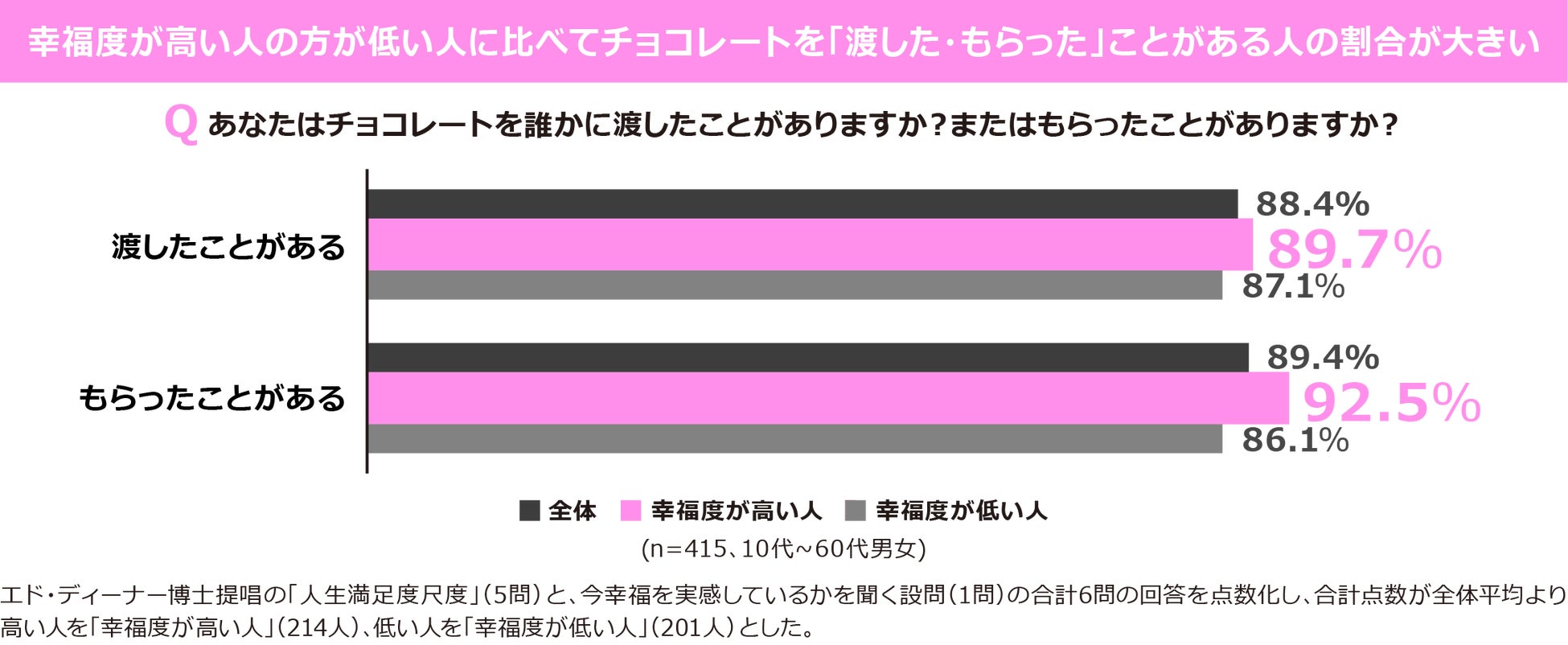 また、幸福度が高い人の方が低い人に比べてチョコレートを渡した・もらったことがある人の割合が大きい傾向が見られ、もらったことがある人の差は6.4ptという結果になりました。チョコレートを渡す・もらうことが幸福度向上と関係している可能性が考えられます。