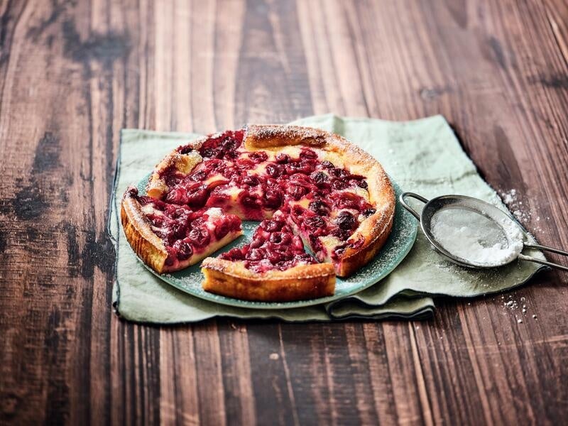 フランス・リムーザン地方の伝統菓子です。サワーチェリーを牛乳・卵・小麦粉・キビ糖などで作るアパレイユ生地と一緒に焼き上げました。軽やかでさわやかな味わいです。