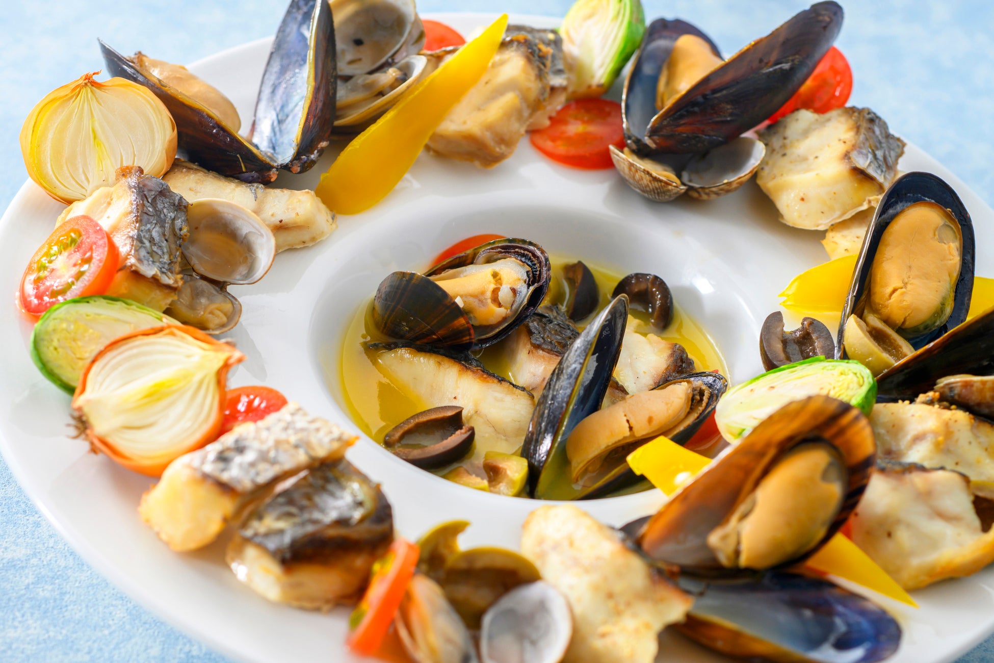 ポンジュース風味のアクアパッツア / 鳴門金時とベーコンのナッツパン粉焼き