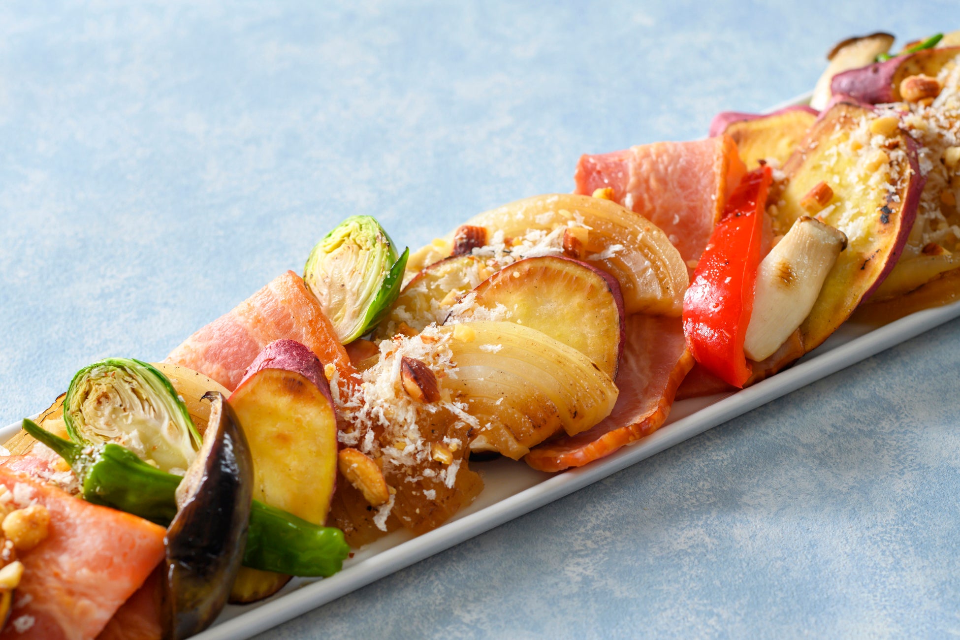 四万十ポーク、阿波尾鶏、讃岐うどんなどバリエーション豊かな四国4県の食材を使ったシェフ自慢のメニューが勢揃いします。カツオのタタキや今治風の焼き鳥、じゃこカツなどの郷土料理もご用意します。