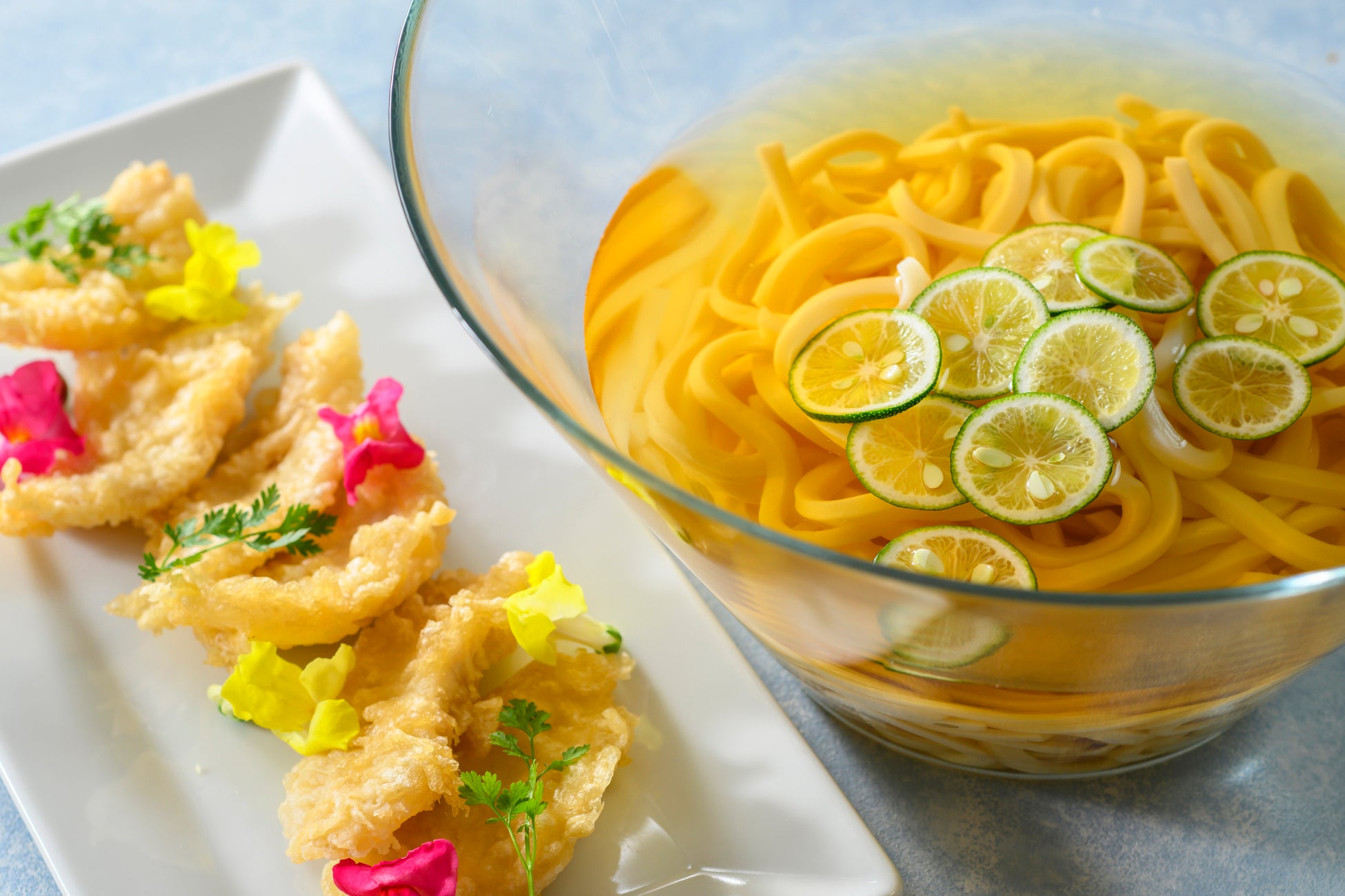 すだちうどん / 四万十ポークのハム仕立て / 今治風焼き鳥
