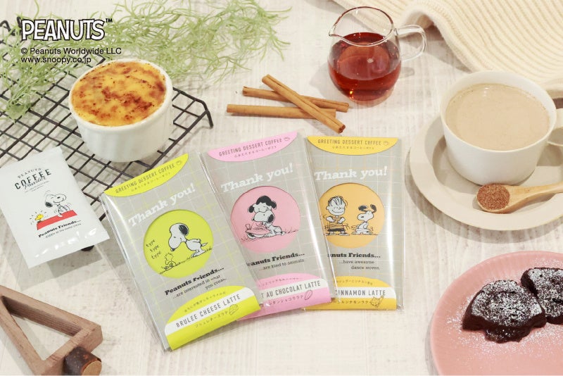 2024年11月11日より、スヌーピーのパッケージデザインのパウダーコーヒーシリーズ「PEANUTS coffee」の新商品として、スイーツの味わいをイメージした「グリーティングデザートコーヒー(GREETING DESSERT COFFEE)」3種が発売されました。それに伴い、サンプルを頂戴し飲み比べましたのでご紹介いたします。