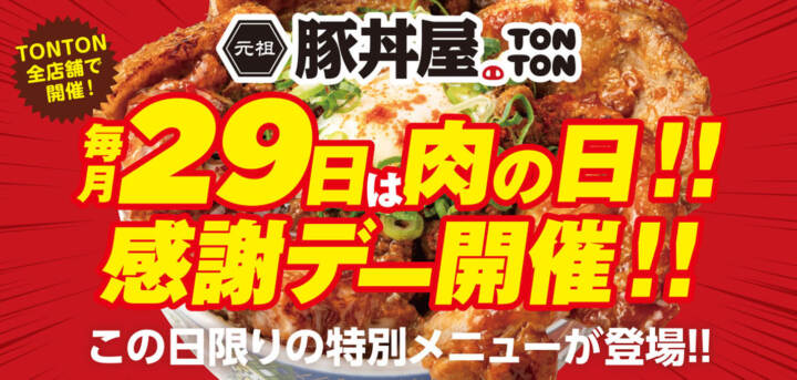 毎月29日は“肉の日”!! TONTON肉の日感謝DAYを実施!! この日だけの限定メニューを販売します!!