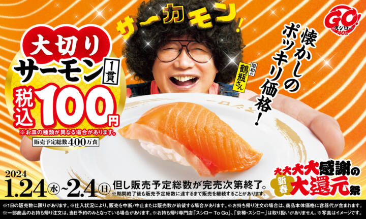 お客さまの笑顔のために精一杯!『大大大大感謝の新春大還元祭』開催!今回の税込100円ネタは「大切りサーモン」!さらに、「大とろ」や…
