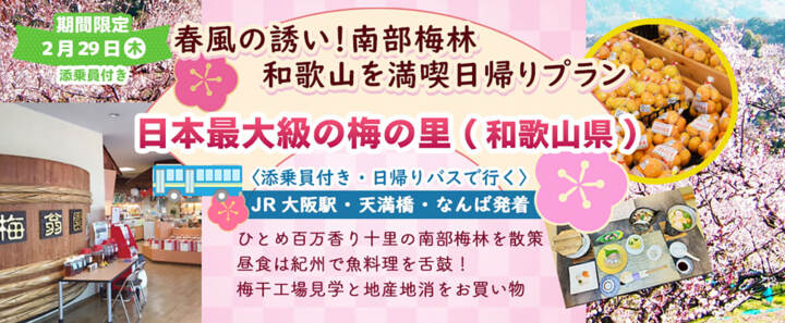 2月29日(木) お一人様11,500円!【和歌山県 みなべ】〈大阪駅・天満橋・なんば発着・添乗員付き〉春風の誘い!日本最大級の梅…