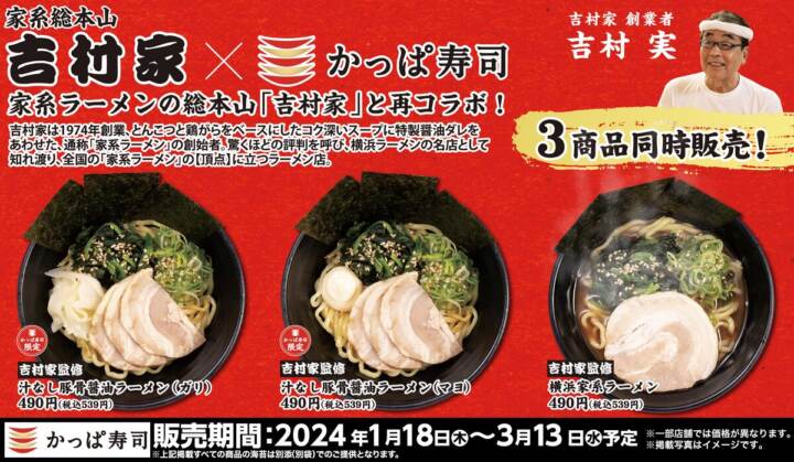 かっぱ寿司「本格ラーメンシリーズ」第28弾、「家系総本山 吉村家」と再コラボ かっぱ寿司限定『家系まぜそば』と『横浜家系ラーメン』…