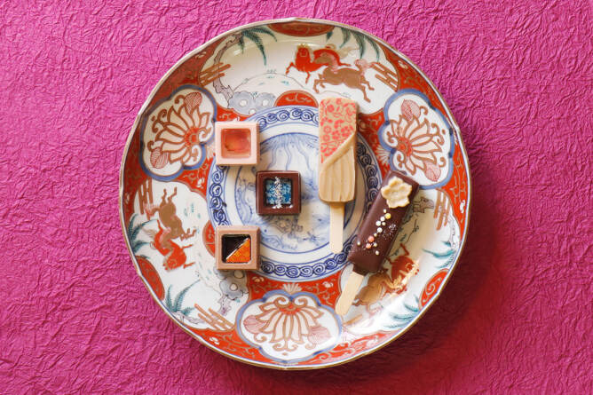 日本の伝統美に彩られる京都のショコラ。「ベルアメール 京都別邸」のチョコレートと、「奥田連峯堂」の古美術の組み合わせで、日本の伝統…