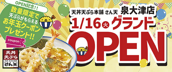 【天丼・天ぷら本舗 さん天】泉大津店が1月16日(火)にグランドオープン!