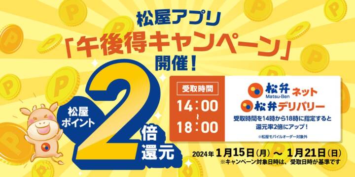 【松屋フーズ】14時~18時がお得!松屋アプリ「午後得キャンペーン」開催!