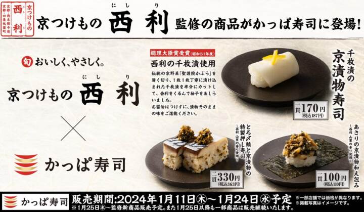 京都漬物の老舗「京つけもの 西利」×かっぱ寿司 新たな味わいを提案 「京つけもの 西利」監修『京漬物を使った寿司』5品他を販売