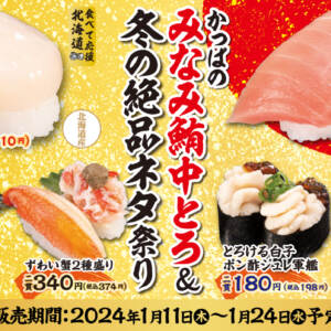 「みなみ鮪中とろ」「金目鯛」など新年を彩るごちそうネタがかっぱ寿司に大集合 2024年初祭り『かっぱのみなみ鮪中とろ&冬の絶品ネタ…