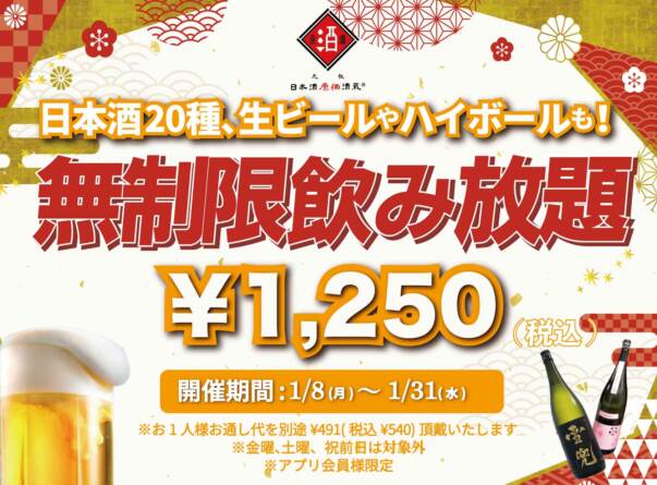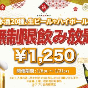 時間無制限(最大11時間)日本酒飲み放題¥1,250(税込)|日曜~木曜日、1日30名様限定┃1月8日~31日、日本酒原価酒蔵全店…