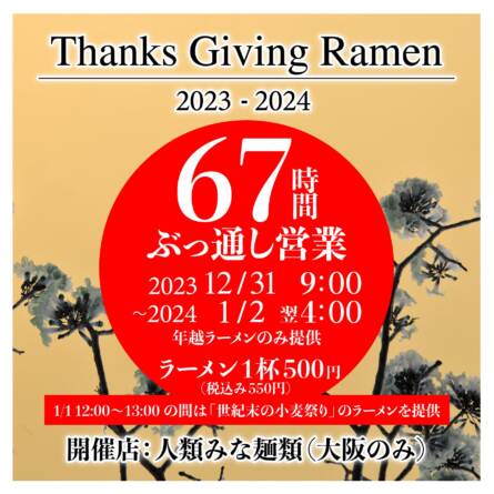 UNCHI株式会社が年末年始に67時間ぶっ通し営業!限定ラーメン「Thanks Giving Ramen 2023〜2024」を1…