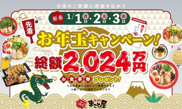 【お年玉キャンペーン!】ラーメンまこと屋全店で『総額2024万円<数量限定>お食事券プレゼント』開催!2024年1月1日(月)〜1…