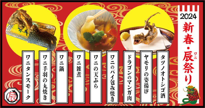 2024年の干支「辰」を食べて開運!? ジビエ居酒屋「米とサーカス」で”ワニ雑煮” ”ワニ手羽の丸焼き” ”タツノオトシゴ酒”など…