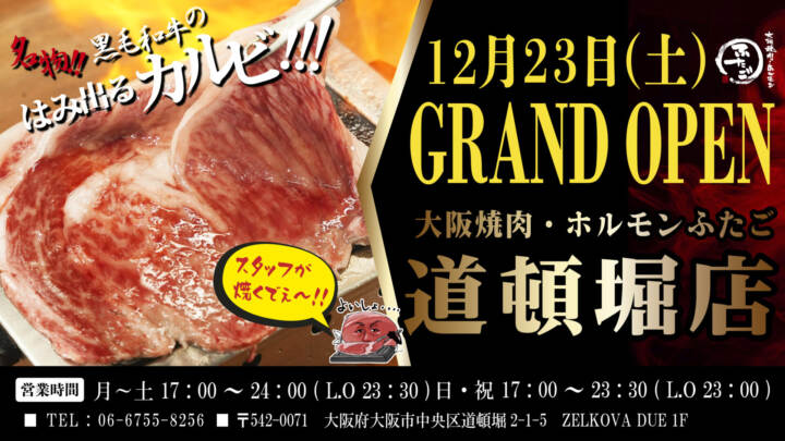 “名物!!黒毛和牛のはみ出るカルビ”で話題の「大阪焼肉・ホルモン ふたご」、大阪・道頓堀に12月23日(土)グランドオープン!