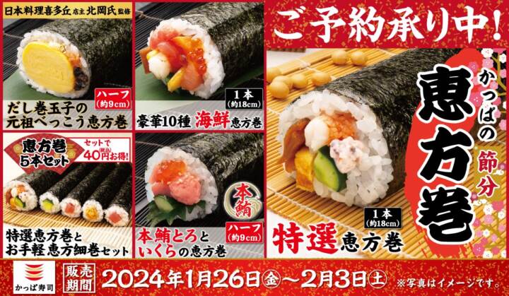 かっぱ寿司より、寿司屋こだわりの「恵方巻」がいち早く予約受付開始 定番の『特選恵方巻』や名店監修の逸品、手軽な細巻のセットなどが登…