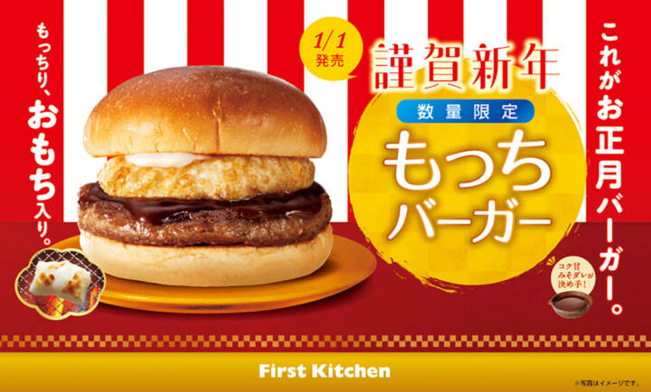 謹賀新年 これが、お正月バーガー。1/1(月)より お餅を入れた 「もっちバーガー」 発売!もっちり食感が楽しめる 数量限定・ファ…