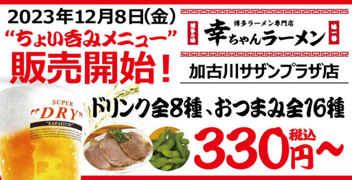 【期間限定】ラーメン居酒屋誕生! 博多一幸舎プロデュース「幸ちゃんラーメン加古川サザンプラザ店」が2023年12月8日(金)より気…