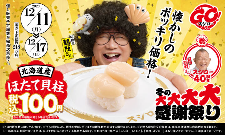 甘みが強く身がぎゅっと引き締まったほたてがお得に楽しめる!「北海道産ほたて貝柱」が税込100円で登場!また、スシロー公式キャラクタ…