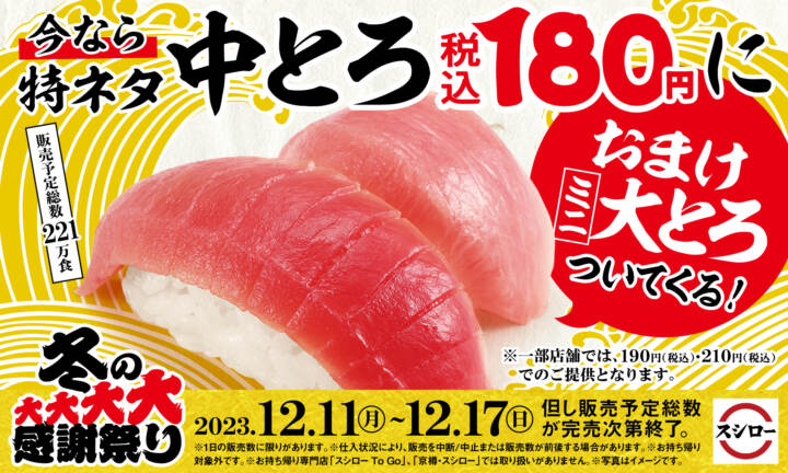 『冬の大大大大感謝祭り』から大還元商品が登場!!「特ネタ中とろ」の価格そのままで“ミニ大とろ”がついたお得な一皿「特ネタ中とろ お…
