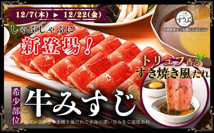 【“牛みすじ”とトリュフの豪華共演‼】12/22迄の期間限定!一人鍋しゃぶしゃぶ“すうぷ静岡パルコ店”の一部コースにて希少部位『牛…