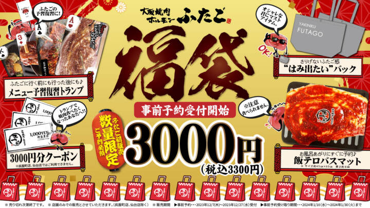 「大阪焼肉・ホルモン ふたご」初の福袋販売決定!お風呂あがりに焼肉食べたくなる“飯テロバスマット”やメニューの予習復習トランプなど…
