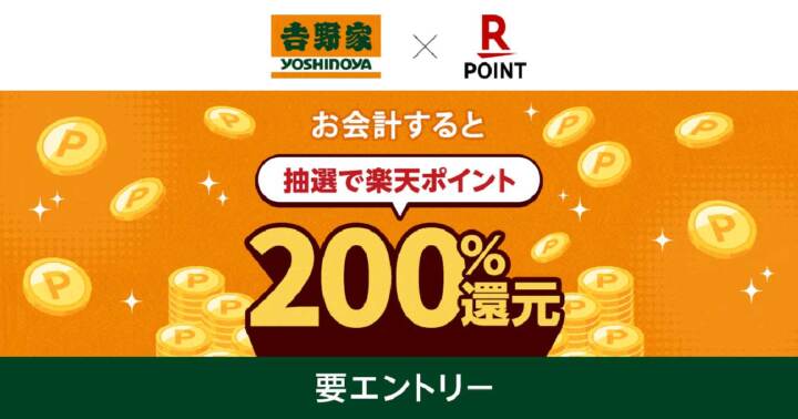 「楽天ポイントカード」、「吉野家」にて抽選で「楽天ポイント」200%還元のキャンペーンを実施!