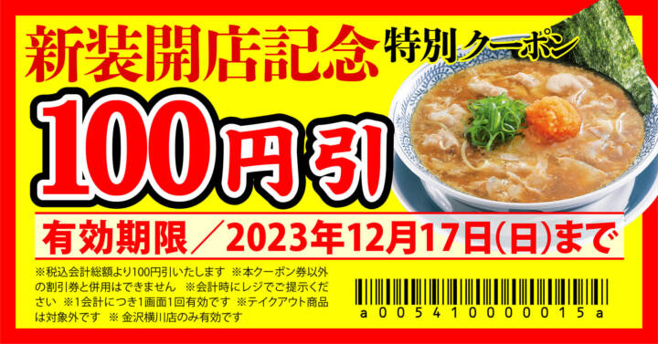 【丸源ラーメン】『丸源ラーメン 金沢横川店』が2023年12⽉8日(金)に新装開店!