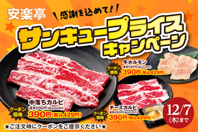 安楽亭から今年一年の感謝を込めて!人気の焼肉が税別390円の年末大感謝価格で登場!