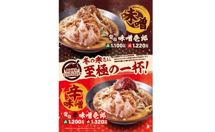 壱角家の冬の定番メニュー!コクのある特製味噌と焦がしにんにくが絡んだスープが冷えた体を温める!壱角家から『背脂味噌壱郎』と『背脂辛…