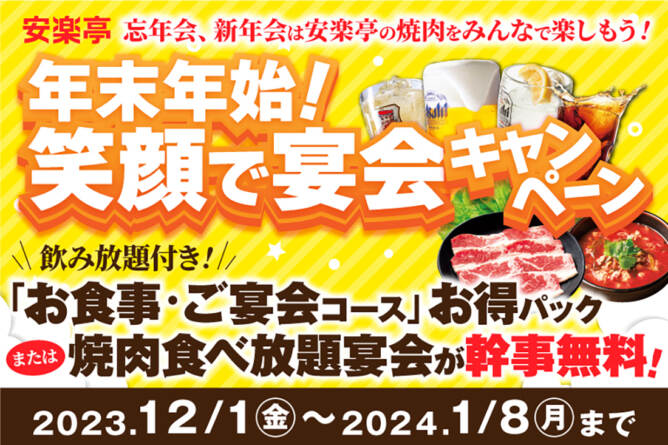 忘新年会も、安楽亭の美味しい焼肉で笑顔満開!ゆったり3時間の焼肉宴会コースや幹事様無料の食べ放題!