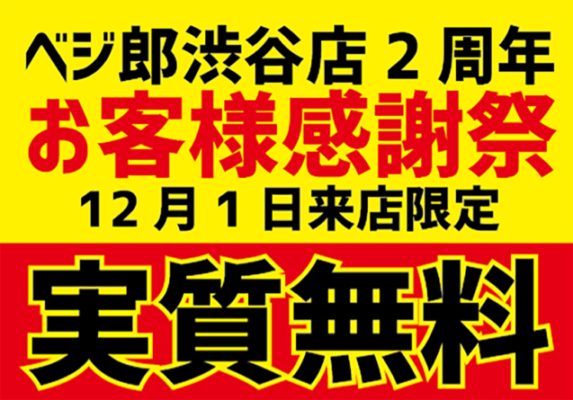 『肉野菜炒め ベジ郎渋谷総本店』2周年記念 お客様感謝祭 飲食代実質無料!!