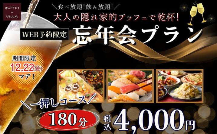 【忘年会に最適‼食べ飲み放題のお得なプラン登場‼】WEB予約限定!二子玉川の隠れ家的ブッフェ『ブッフェ ザ ヴィラ』にてバラエティ…