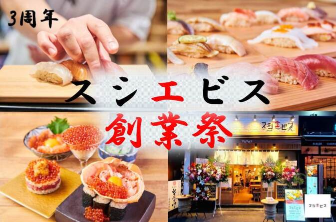 【スシエビス恵比寿本店創業3周年記念、スシエビス3店舗にて創業祭を開催!】総額300万円分超え!?お客様全員に金券プレゼントやドリ…