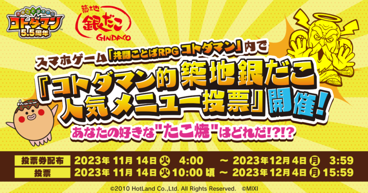 築地銀だこが、人気スマホゲーム 「コトダマン」 と初コラボレーション!ゲーム内で、「築地銀だこ人気メニュー投票」 を開催!!